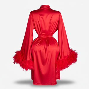 Wrap yourself in pure luxury with our Royal Garnet Feather Robe. Crafted from premium satin fabric, this robe drapes effortlessly over the body with a smooth, silky finish that reflects elegance and sophistication.